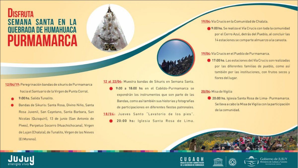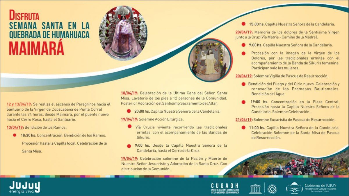 En Maimará a las 15.00 en la Capilla Nuestra Sra. de la Candelaria será la celebración solemne de la Pasión y muerte de Jesús y Adoración a la Santa Cruz. El sábado a las 9.00 se realizará la procesión con la imagen de la Virgen de los dolores por las tradicionales Ermitas, con sikuris mujeres y participación sólo de mujeres. A las 19.00 Vigilia Pascual. Concentración en la Plaza Central. Procesión hasta la Capilla Nuestra Señora de la Candelaria.