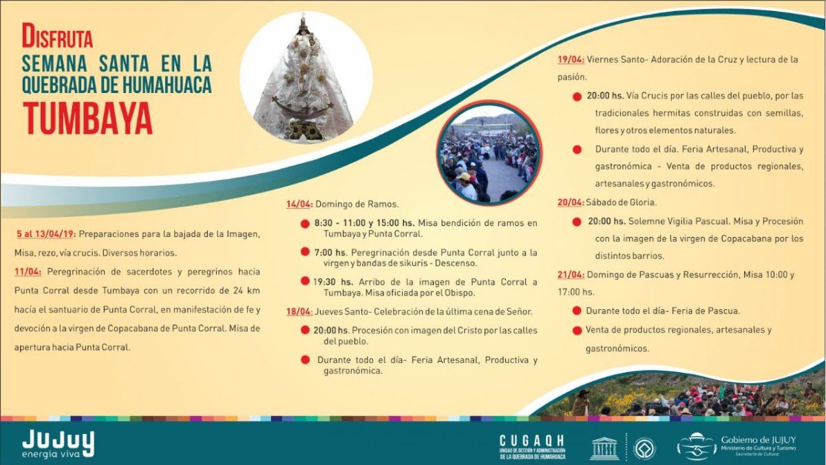 En Tumbaya este viernes santo a las 20.00 se realizará el Via Crucis por las calles del pueblo y por las tradicionales Ermitas construidas con semillas, flores y otros elementos naturales. Además durante todo el día habrá Feria Artesanal, productiva gastronómica, venta de productos regionales, artesanales y gastronómicos.