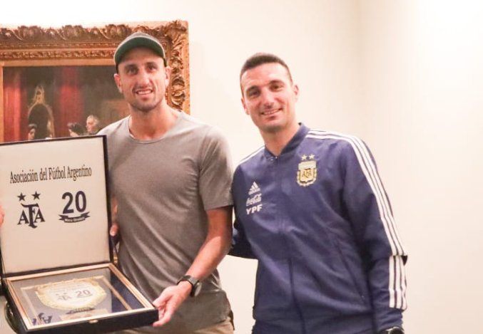 El exjugador de básquet se acercó al hotel donde está concentrado el plantel de Lionel Scaloni para compartir un momento junto a los jugadores y toda la delegación.