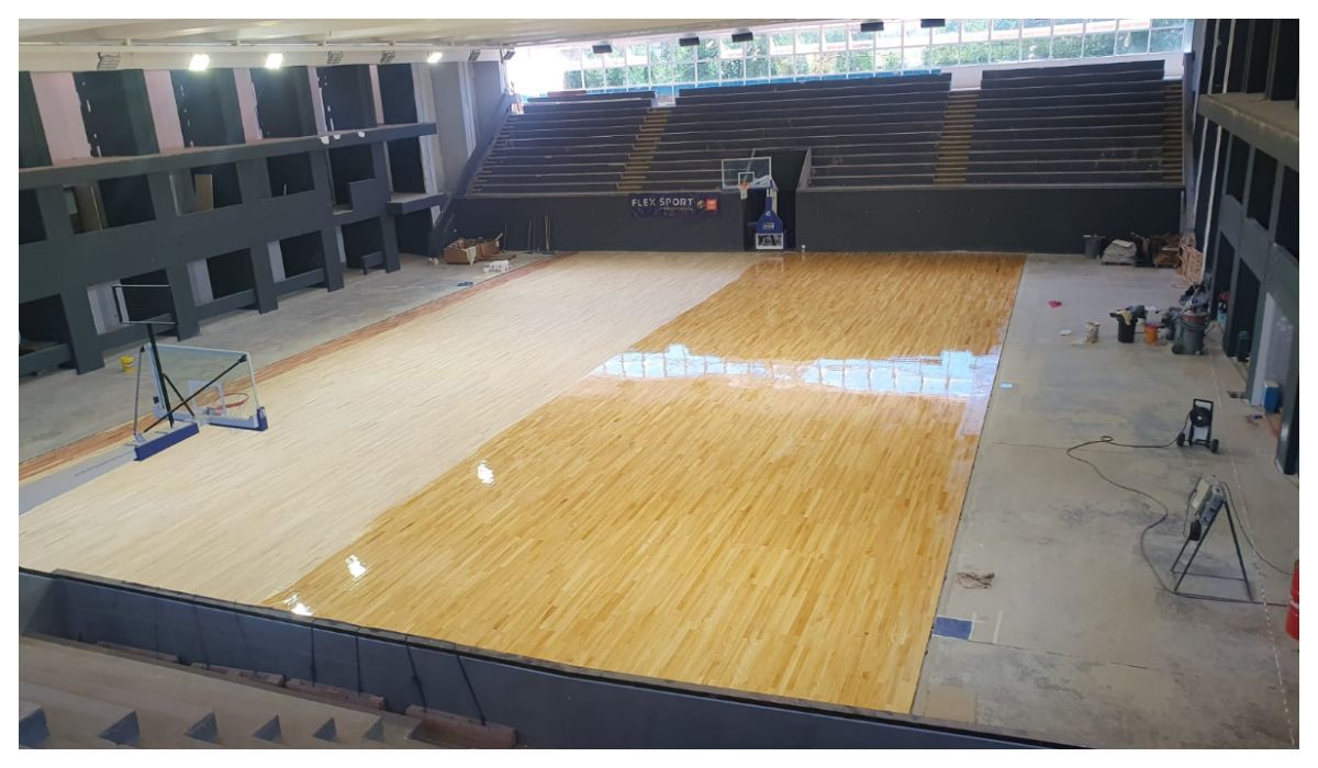 El grueso de la inciativa ya está prácticamente concluida. Se colocó el nuevo piso flotante, las jirafas con los aros y los vestuarios están terminados. De a poco van dejando lista la parte electrónica y en estos días llegan las tribunas telescópicas.
