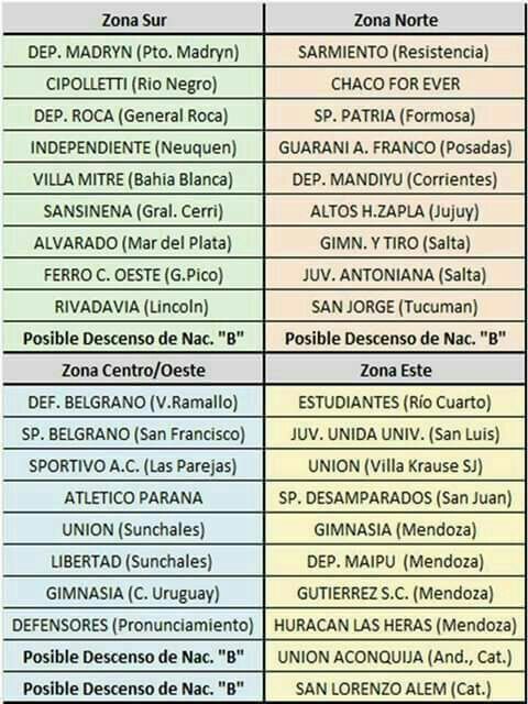 Pasando en limpio, según lo que se pudo ver el viernes, la nueva “zona norte” quedó conformada de la siguiente manera: Zapla (Jujuy), Sarmiento (Resistencia), Chaco For Ever, Sportivo Patria (Formosa), Guaraní A. Franco (Misiones), Deportivo Mandiyu (Corrientes), Gimnasia y Tiro (Salta), Juventud Antoniana (Salta), San Jorge (Tucumán) y Crucero del Norte (Misiones) o bien también podría ser Central Córdoba (Santiago) en caso de que descienda de la B nacional.
