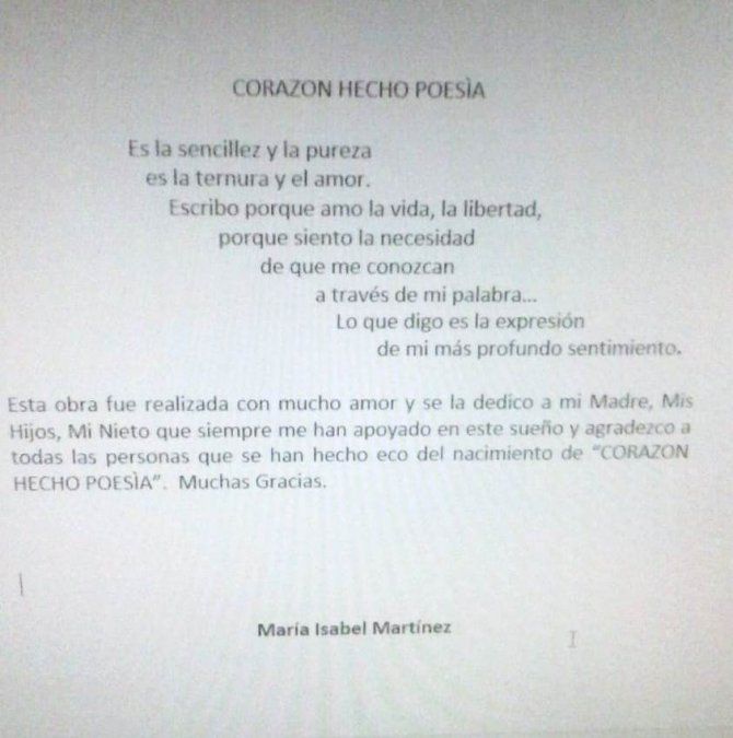 Seguidamente explicó que su libro "Corazón hecho poesía" constituye una recopilación de poemas de amor y poemas a nuestra tierra. Sostuvo que "fue mucho el esfuerzo para poder dar a luz el libro, está hecho con amor y lo que escribí es la más pura expresión de mis sentimientos".
