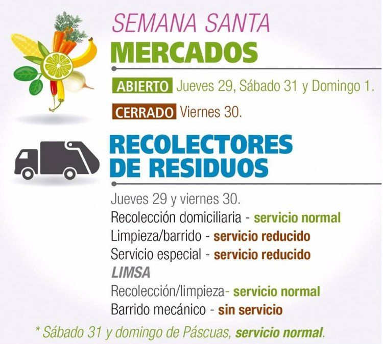 Por otra parte, la recolección de residuos será normal los días jueves 29, viernes 30 y el lunes 2 de abril. La limpieza/barrido y los servicios especiales funcionarán bajo la modalidad de servicio reducido.