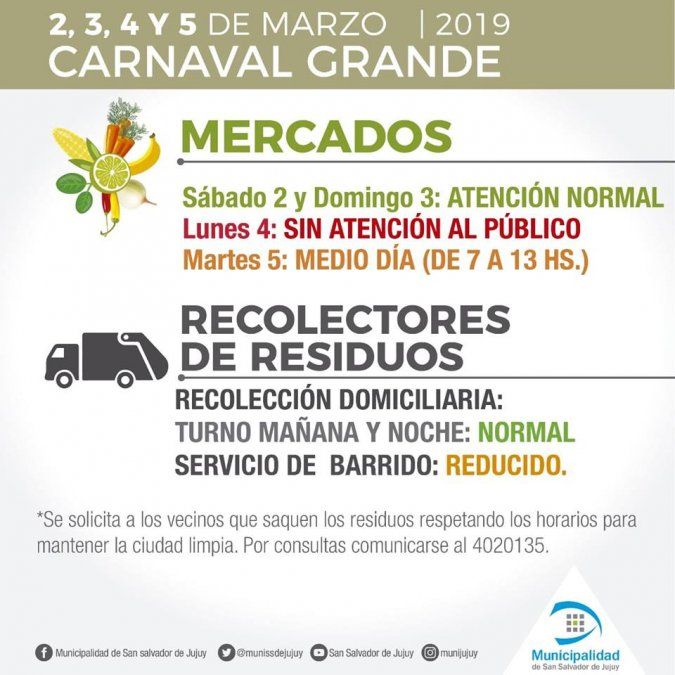 Teniendo en cuenta que este lunes y martes son feriados nacionales por carnaval, la municipalidad dio a conocer cómo funcionarán los mercados y la recolección de residuos en capital.