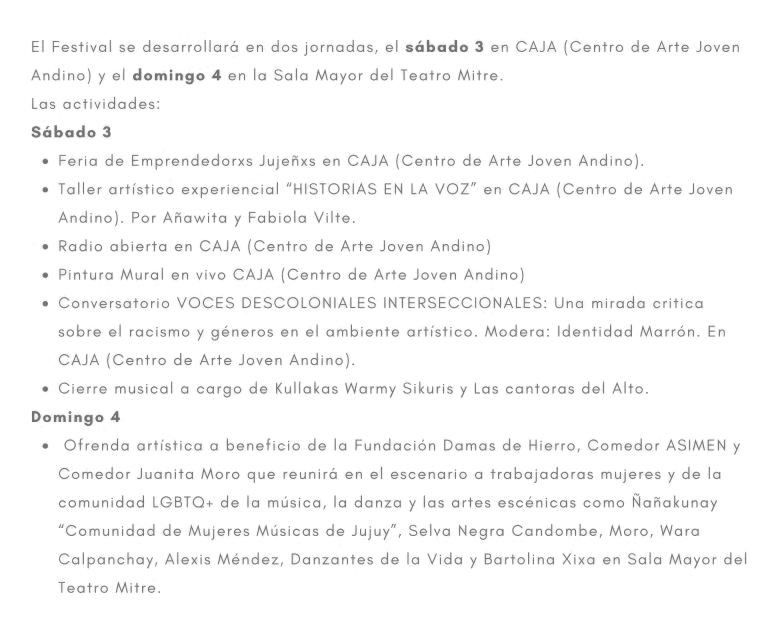 "En el Pachakuti transformación de estos tiempos las mujeres e identidades disidentes demuestran que traen con sus luchas las claves posibles para un nuevo comienzo. Por este motivo, con profundo respeto y con el deseo de ser grito artístico que emerge y transforma en este nuevo tiempo, vemos sumamente necesario apoyar y expandir estas manifestaciones”, argumentaron.