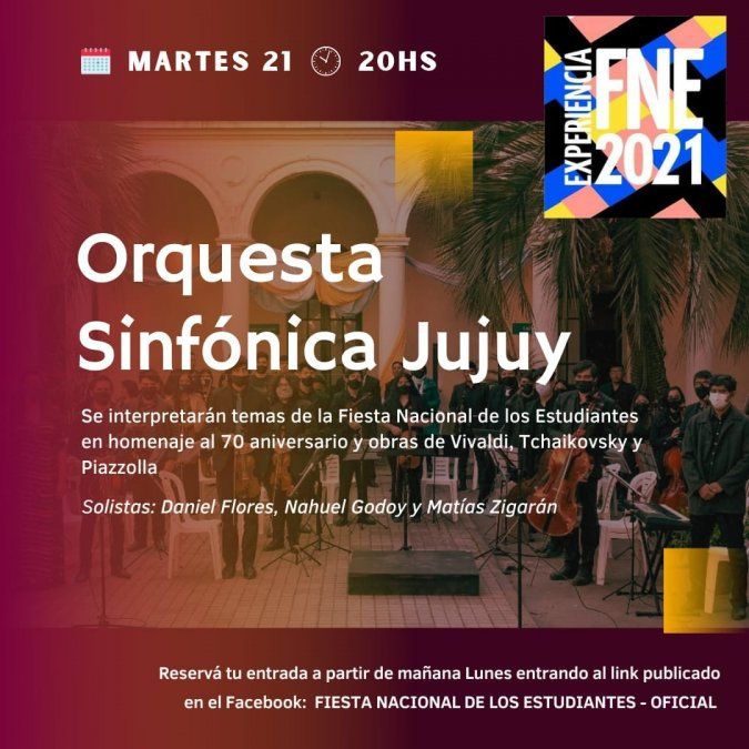En el marco de los 70 años de la Fiesta Nacional de los Estudiantes, la Orquesta Sinfónica Jujuy ofrecerá un concierto, este martes 21 de septiembre a las 20 hs. en Ciudad Cultural.