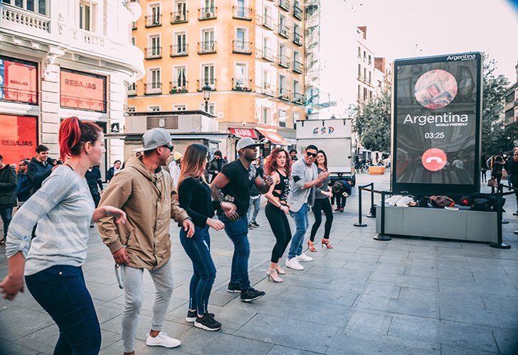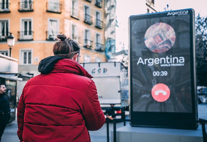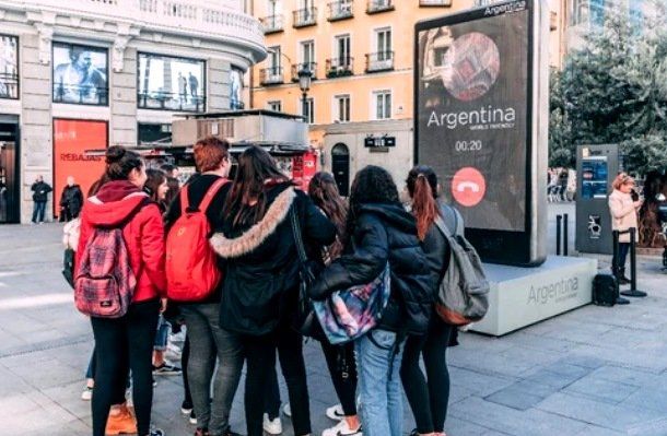 En una de las esquinas más concurridas de Madrid, se instaló un teléfono de tres metros de altura a través del cual, los transeúntes, pueden hablar con un turista español de vacaciones en Argentina, para que les comparta sus experiencias en vivo. Allí se muestran La Quebrada de Humahuaca, las Cataratas del Iguazú, las Salinas Grandes, Bariloche, entre otros destinos.
