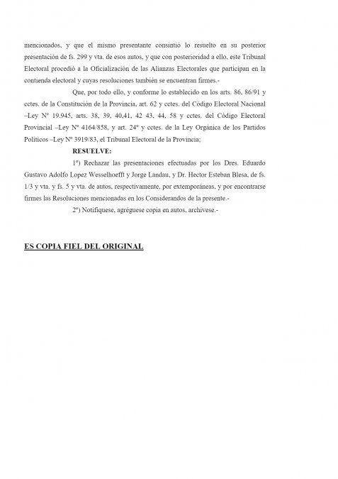 El Tribunal Electoral de Jujuy , integrado por Federico Francisco Otaola, Alejandro Ricardo Ficoseco y Alejandro Hugo Domínguez, rechazó ambas presentaciones «por extemporáneas».