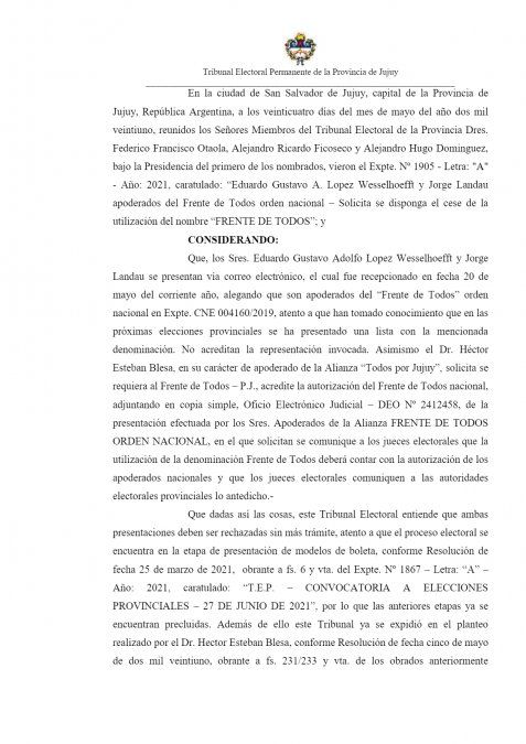 En medio de la fragmentación del PJ local, la Justicia Electoral jujeña rechazó un planteo realizado por los apoderados del Frente de Todos a nivel nacional, que no avalan que la facción de Rubén Rivarola utilice la denominación "Frente de Todos" en las boletas. Esto argumentando que el presidente del PJ no permitió la unidad del peronismo.