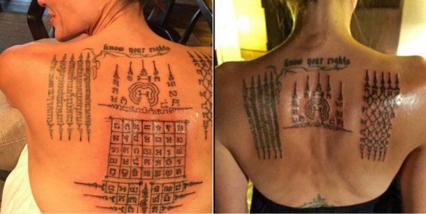 La pareja había ido a visitar a dicho religioso llamado Ajarn Noo Kanpai, quien le marcó las diversas inscripciones, figuras geométricas y formas animales a los muchos tatuajes que Jolie ya tenía en su espalda. Para ello utilizó una técnica milenaria, mucho más dolorosa que las técnicas actuales.