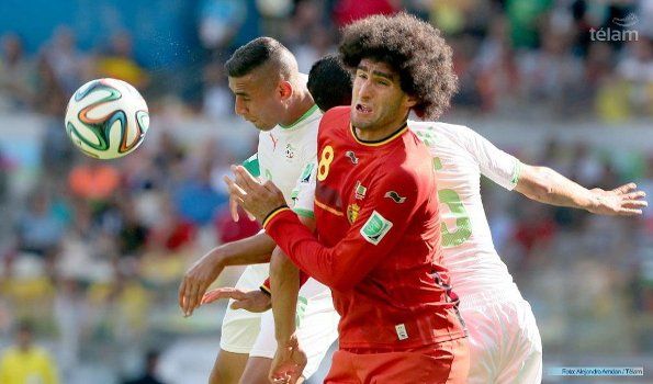 Bélgica, con el transcurrir de los minutos, aumentó su dominio y a los 25 minutos alcanzó el merecido empate con un cabezazo de Fellaini (le ganó en el salto a Rafik Halliche), luego de un centro desde la izquierda de Kevin de Bruyne, el dueño de una pegada bárbara y quien se encarga de todas las pelotas paradas.