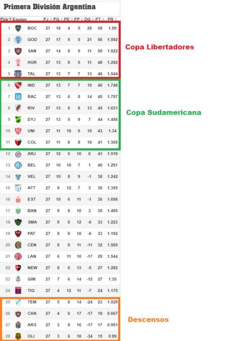 Con Boca ya campeón del torneo, y los cuatro conjuntos descendidos (Chacarita, Arsenal, Olimpo y Temperley) estos partidos definieron el ingreso a la Copa Libertadores y Copa Sudamericana.
