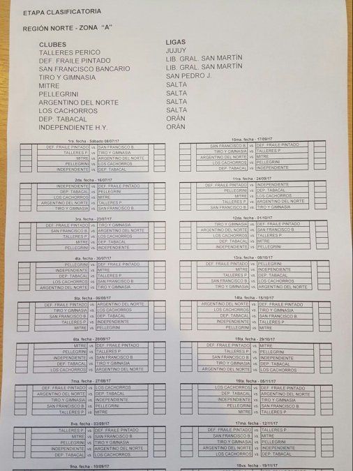 En la primera fecha Defensores de Fraile Pintado recibirá a San Francisco Bancario, mientras que Talleres de Perico hará de local en el estadio Dr. Plinio Zabala frente a Tiro y Gimnasia de San Pedro.