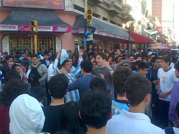 El lugar elegido para los festejos fue la intersección de Lavalle y Belgrano con la iglesia de San Francisco como telón. En pocos minutos una multitud se reunió en esa esquina, mientras una interminable caravana rodeaba la Plaza Belgrano y se dirigía con el ritmo de un “caracol con hernia” hacia el punto central de la alegría.