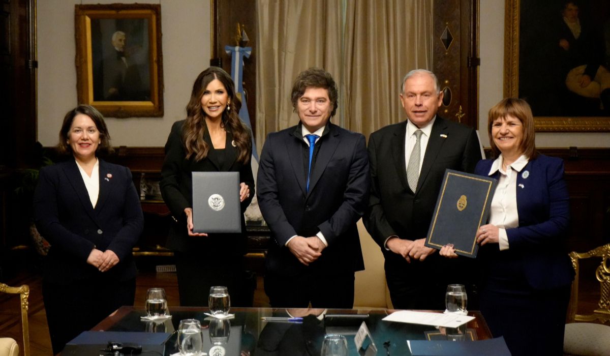 Tras posar para los fotógrafos, Bullrich acompañó a Noem al despacho de Javier Milei. "Te sigo", le dijo la estadounidense. Participaron también de dicho encuentro el jefe de Gabinete de la Secretaria de Seguridad, Corey Lewandowski; la encargada de Negocios de la Embajada de EE.UU., Heidi Nicole Gómez; el asesor, Robert Thomas Law. Por los funcionarios nacionales, además de la ministra de Seguridad participó el Canciller, Gerardo Werthein.