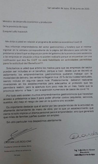 “Un establecimiento que cierra no sólo implica un drama personal para el emprendedor sino que generará que miles de familias jujeñas se queden sin empleo”, expresan en una nota Luis Alonso, presidente de la Unión de Empresarios, y Cristian Boglione, titular de la Cámara de Hoteles, Bares, Restaurantes y afines.