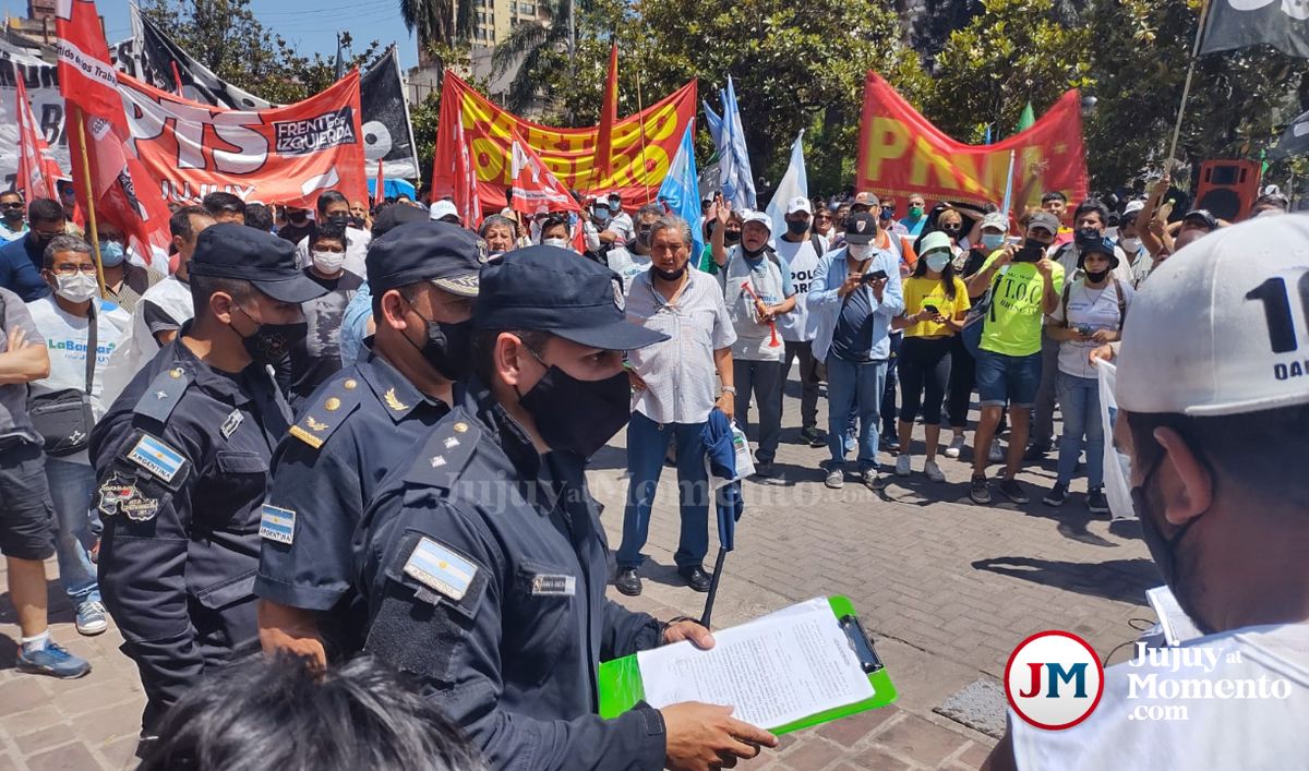 “Estamos en unidad, en apoyo a los trabajadores del Banco de Desarrollo y al gremio de La Bancaria, recién venimos de ser reprimidos y provocados por Infantería y la policía de Gerardo Morales, encima ahora les están haciendo la contravencional”.