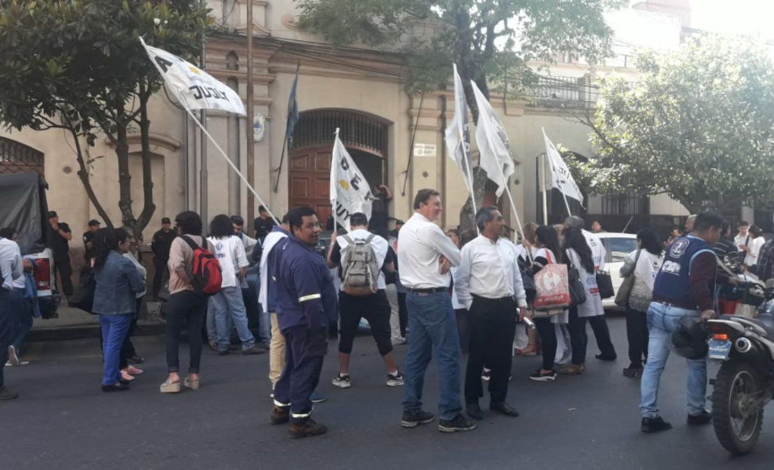 Los distintos gremios que integran el Frente Amplio realizaron una jornada de protesta con asistencia a las reparticiones y posterior retiro para movilizar al Juzgado en lo Contencioso Administrativo ubicado en calle Senador Pérez donde mantuvieron una audiencia a raíz de la presentación de un amparo para que se inste al gobierno a negociar las paritarias.