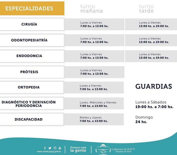 A la vez se incorpora por primera vez en la provincia el servicio de guardias odontológicas nocturnas, significando 24 horas de atención. De esta manera el plantel de profesionales garantizará al menos un especialista y un asistente en cada una de las áreas de atención.