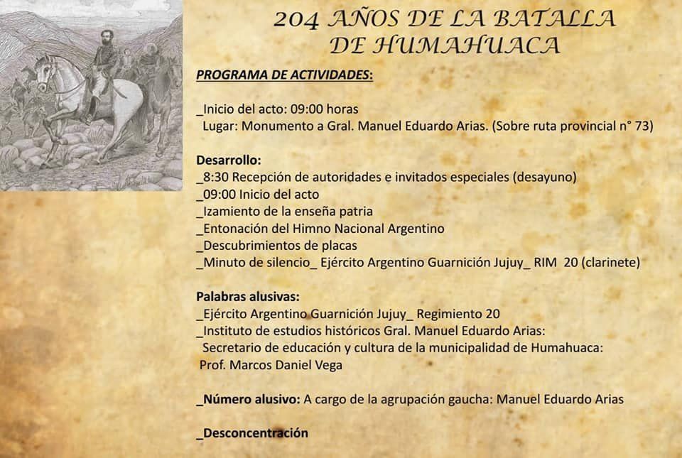 La Municipalidad de Humahuaca realizará un acto conmemorativo que se llevará a cabo hoy a las 9 hs. en el Monumento Gral. Manuel Eduardo Arias.