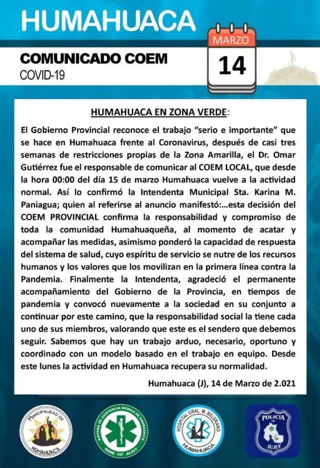 El Comité Operativo de Emergencia de la Provincia resolvió declarar nuevamente "zona verde" a la ciudad de Humahuaca, a partir de las 00 hs. de este lunes 15 de marzo. De esta forma se podrá retomar la actividad normal, tras casi tres semanas de restricciones.