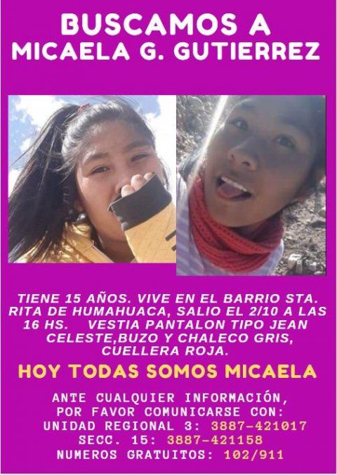 Nuevo caso de desaparición en Jujuy. Una familia oriunda de Humahuaca busca intensamente a Micaela Gutiérrez de 15 años de edad, quien tiene domicilio en barrio Santa Rita de dicha localidad.