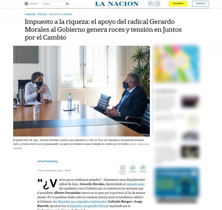- El gobernador Gerardo Morales continúa dando muestras de apoyo al oficialismo.
