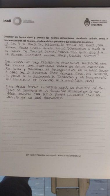 La denunciante, una ciudadana trans, dijo en la presentación realizada ante el organismo que ella fue la primera ciudadana trans que trabajó al frente de la Oficina de Coordinación de Diversidad y No Discriminación del Ministerio de Seguridad de la Nación entre 2015 y 2019. En tanto, Ornella Infante es directora de Políticas Antidiscriminatorias del INADI desde principios de 2020, tras la asunción de Alberto Fernández.