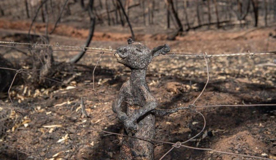 En la foto se ve a un pequeño canguro atrapado en una cerca de alambre, mientras intentaba escapar del voraz incendio. El animal quedó completamente carbonizado.