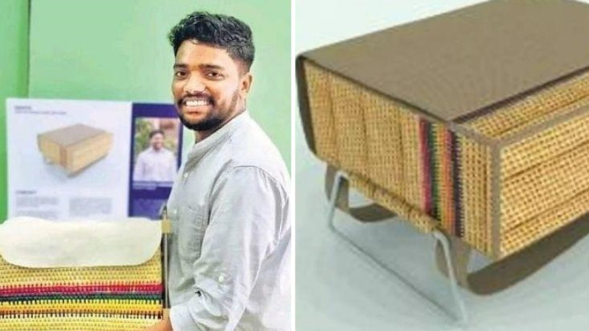 El joven de 24 años viajó a Naina en Uttar Pradesh para colaborar con los artesanos y diseñar este increíble bolso ergonómico con hierba moonj cultivada localmente por los residentes de la zona.