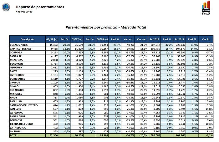 A nivel país, el porcentaje de caída de ventas de 0 Km fue del 34,7%, pasando de 80.238 en septiembre del año pasado a 52.364 en el mismo mes de este año. Con respecto a agosto de 2018, el número se redujo en un 20%, con 13.123 patentamientos menos.