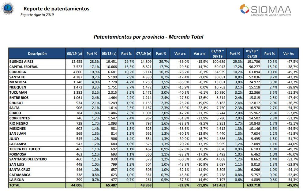 El reporte de patentamientos de agosto de la Asociación de Concesionarios de Automotores de la República Argentina (ACARA) da cuenta de un nuevo derrumbe interanual en todo el país. En la consideración mensual, las ventas cayeron en todas las jurisdicciones excepto en Tierra del Fuego y La Rioja.