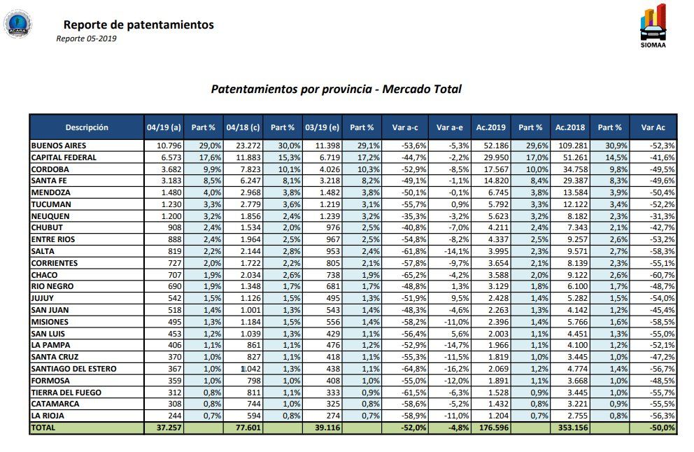 El informe de las ventas de abril de la Asociación de Concesionarios de la República Argentina (ACARA) da cuenta de un nuevo derrumbe interanual en todo el país. No obstante, en la consideración mes a mes, las ventas comienzan a repuntar en algunas provincias.
