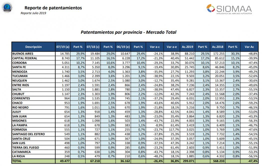 El reporte de patentamientos de julio de la Asociación de Concesionarios de Automotores de la República Argentina (ACARA) da cuenta de un nuevo derrumbe interanual en todo el país. Por el contrario, en la consideración intermensual, las ventas aumentaron en todas las jurisdicciones.