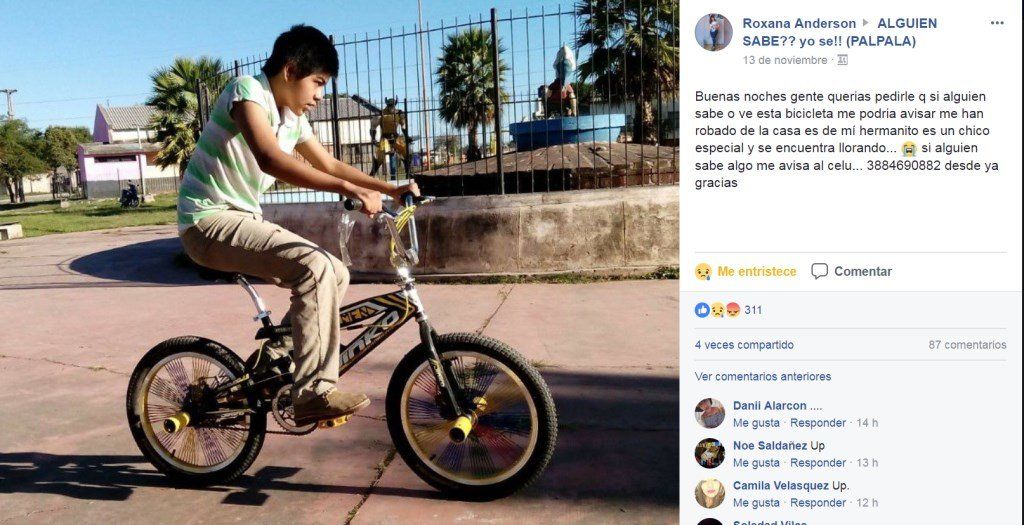 “Alexander tiene 13 años, padece autismo y estudia en la escuela Víctor Mercante en Palpalá. Va a tercer grado con régimen especial, dejó de ir a la escuela Juan Pablo II porque lo golpeaban mucho”, comentó la madre y agregó: “Pedimos que los que ven la bicicleta se comuniquen con la policía o nos avisen al 3884690882, estamos desesperados buscándola, esa bicicleta significa mucho para mi hijo”.