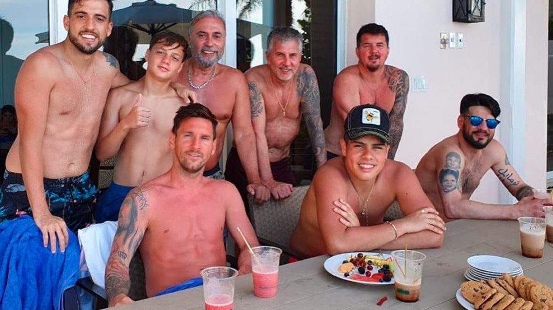 El rosarino disfruta de sus últimos días junto a su numerosa familia y publicó una imagen con la rama masculina de la misma, en la que el capitán de la Selección argentina aparece completamente rojo a causa del sol.