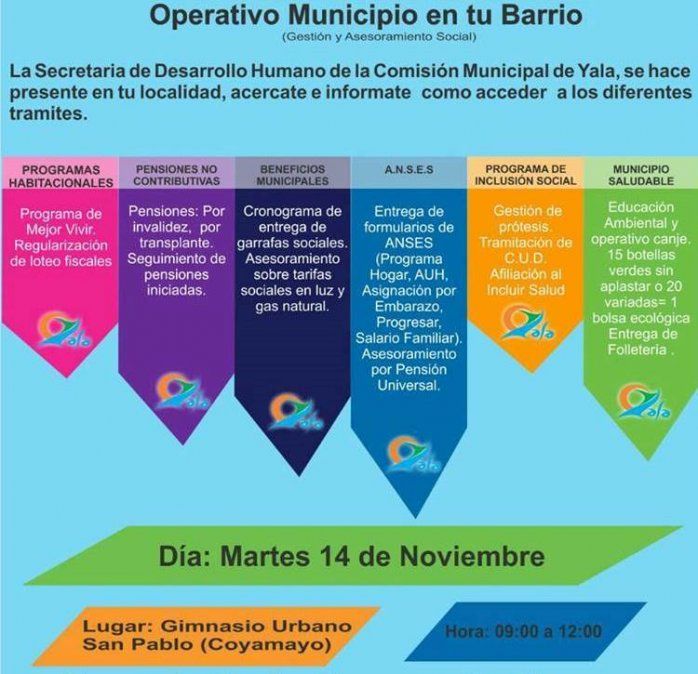 A través de este operativo la municipalidad acercará los servicios del estado a las distintas localidades. El martes 14 de noviembre se apostará en el Gimnasio Urbano de San Pablo (Coyamayo).