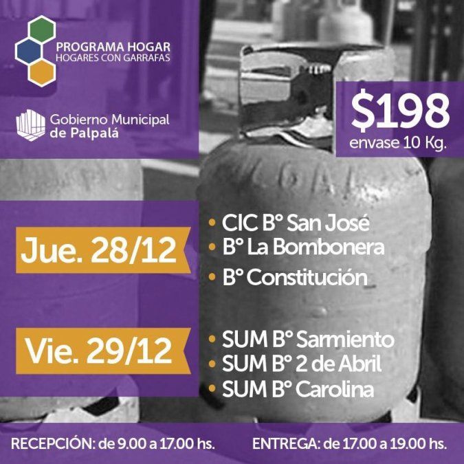 A través del Programa Hogar se procederá a la entrega de garrafas sociales en los barrios de Palpalá, los días jueves 28 y viernes 29 de diciembre.