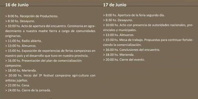 El 1° Encuentro Provincial de Ferias Campesinas y Experiencias de Comercialización de la Agricultura familiar, campesina e indígena tendrá lugar los días viernes 16 y sábado 17. Del mismo participarán el movimiento campesino y comunidades originarias Pucará, Feria campesina Agrícola Ramal y Yungas de San Pedro, Feria de las comunidades Aborígenes UPPAJS de Humahuaca y la Feria campesina de San Salvador de Jujuy.
