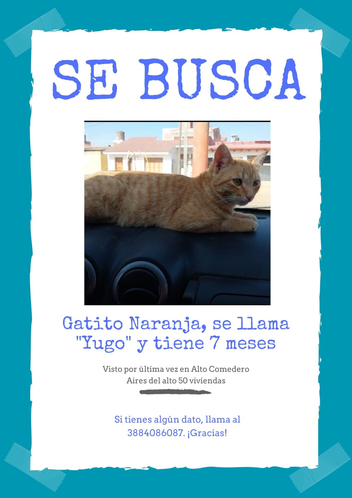 Se trata de un gatito de pelaje naranja, que tiene 7 meses y responde al nombre de "Yugo".