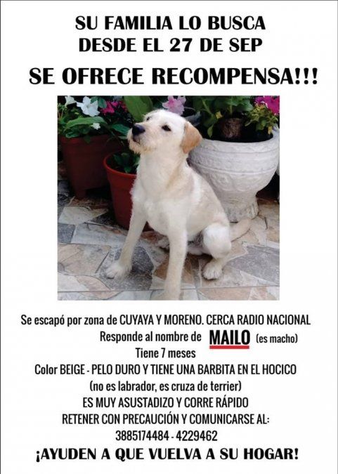 Tienen sólo 7 meses y se perdió por la zona de Cuyaya y Moreno, cerca de Radio Nacional.