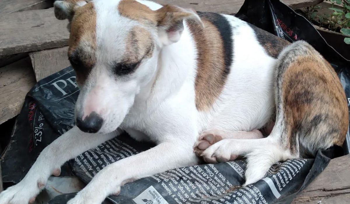 Una hermosa perra de pelaje color blanco con manchas marrones y negras, necesita una familia. La peludita se llama "Chispita" y es de la ciudad de Palpalá.