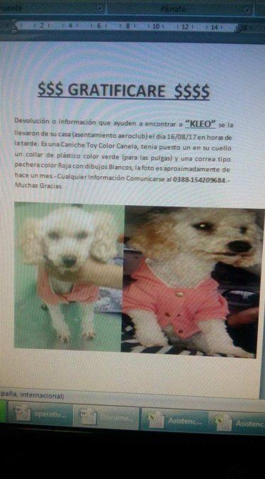 La perrita fue sustraída de su casa el 16 de agosto en el aeroclub a la altura de la Iglesia San Martín de Porres.