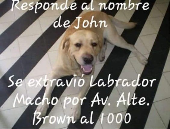 En la tarde noche de este miércoles se extravió un Labrador macho que responde al nombre de John. Salió de casa en calle Almirante Brown asustado, luego de que lanzaran fuegos artificiales en el barrio.