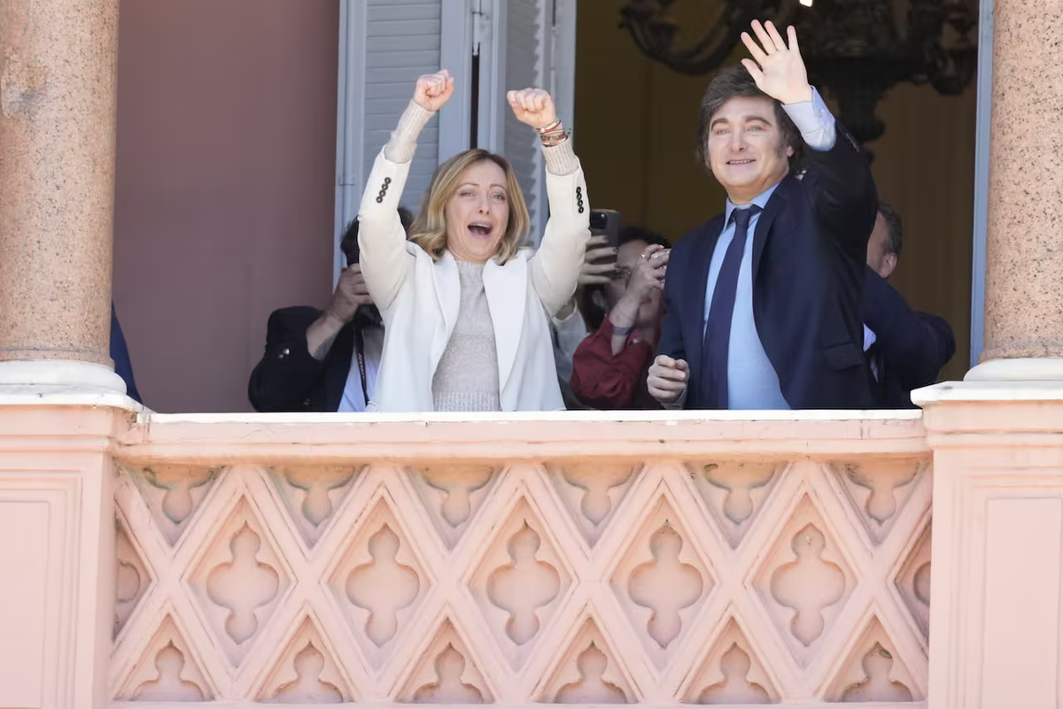 El presidente Javier Milei recibió este miércoles a la mañana a la primera ministra de Italia, Giorgia Meloni, en la Casa Rosada, tras la cena que compartieron anoche ambos mandatarios en la Residencia de Olivos. Estuvieron reunidos por más de una hora, salieron a saludar al balcón de la Rosada y realizaron una declaración conjunta en la que destacaron los puntos en común entre ambas naciones.