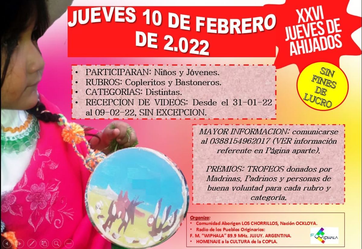De esta forma es que el jueves de ahijados se hace eco en la localidad de Bárcena, donde tradicionalmente se realiza un encuentro de canto de coplas, recitado y bastoneo, para niños y adolescentes de entre 5 y 15 años, el cual es organizado por la Comunidad Aborigen (COMAB) “Los Chorrillos”.