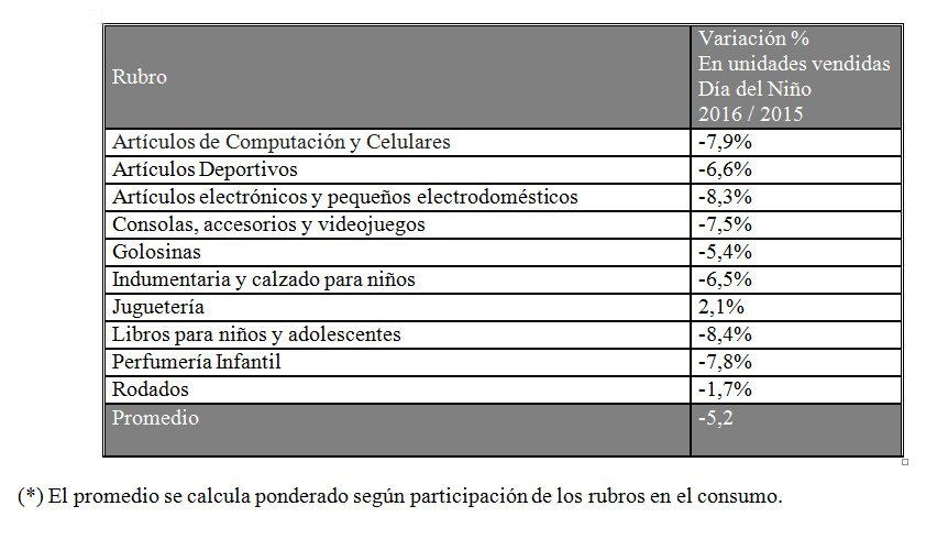 Las siguientes fueron las variaciones en las cantidades vendidas por el Día del Niño 2016, frente a igual fecha del año pasado, relevadas en 690 comercios del país