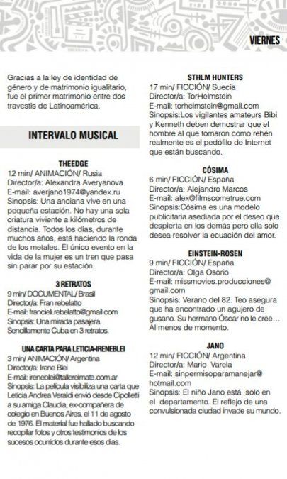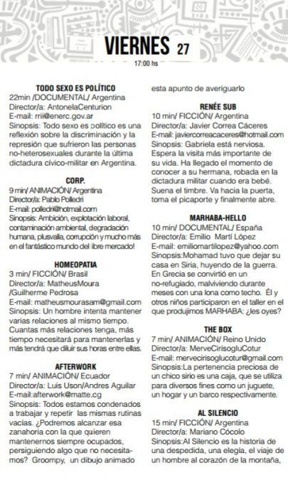 Luego de una semana de intensa actividad, la muestra se despide hasta el año que viene con la última jornada de proyecciones. Aquellos que no quieran perderse la oportunidad, podrán acercarse desde las 17.00 a la Sala Galán del Teatro Mitre.