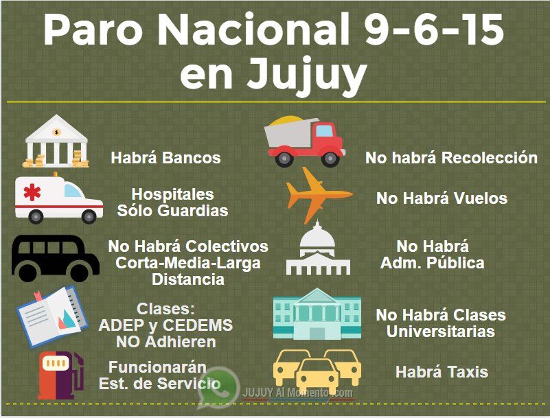 Jujuy | Jujuy | Así son los servicios en Jujuy por el paro nacional JujuyalMomento preparó una infografía para que sepas que servicios adhieren al paro nacional de hoy. 09 de junio de 2015 - 00:00