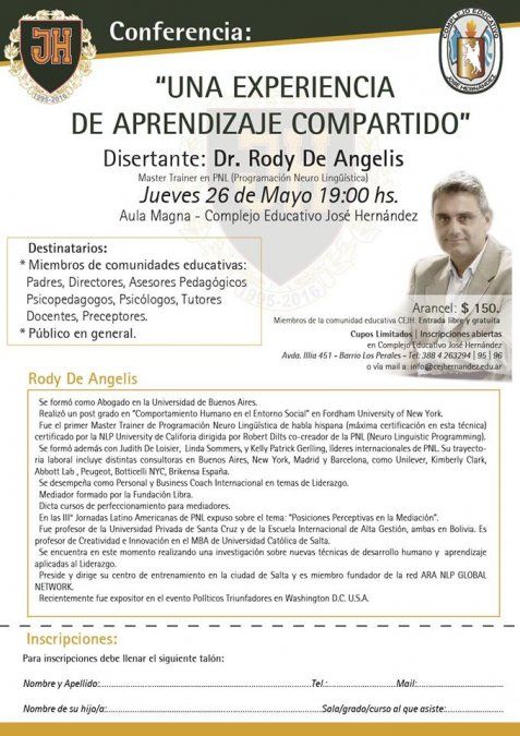 El Doctor Rody De Angelis, Master Trainer en Programación Neuro Lingüística llega a Jujuy para brindar una charla sobre “una experiencia de aprendizaje compartido”, el jueves 26 de mayo a las 19 en el Complejo Educativo José Hernández.